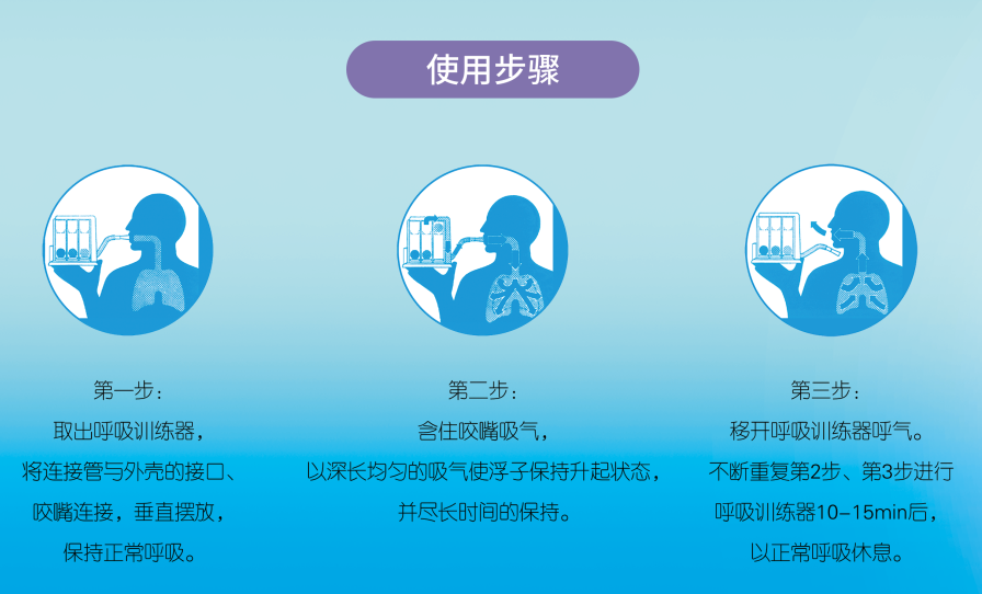 第3步,移开呼吸训练器并吸气。展开呼吸训练后,反复第2步和第3步10-15分钟,并保持正常呼吸。